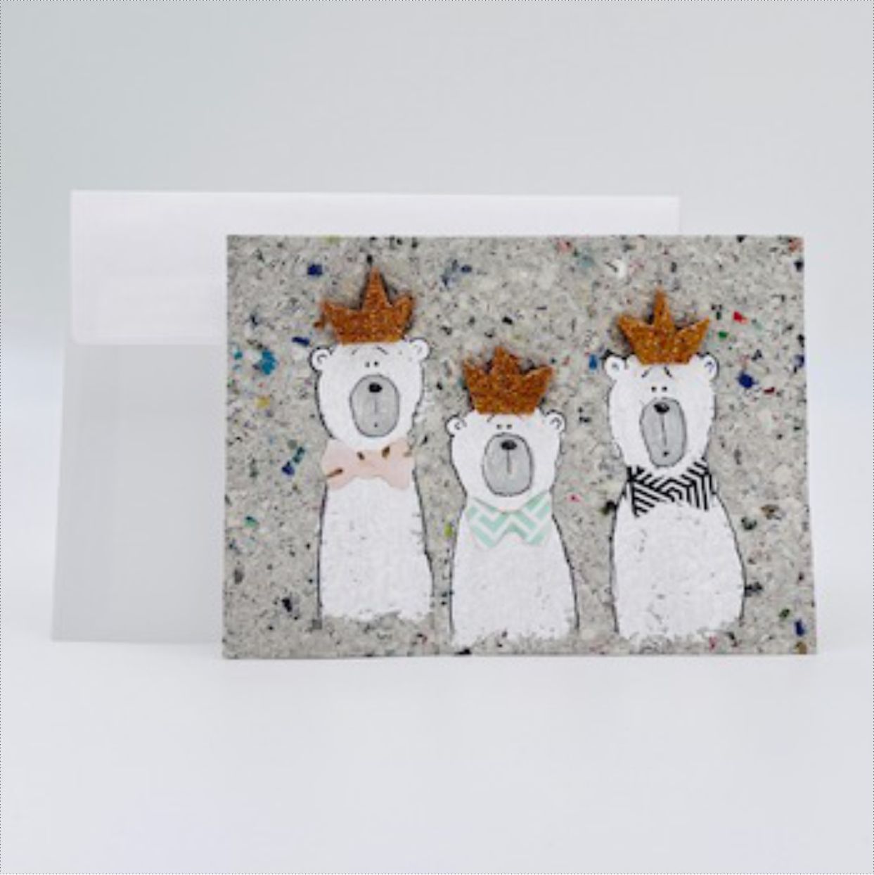 Postkarten mit drei handgezeichneten und gemalten Bären, veredelt mit einer charmanten Korkkrone. Ideal für liebe Grüsse, Geschenke oder als kleine Kunstkarten. Wird mit einem halbtransparenten Kuvert geliefert. Diese Karte ist aus handgeschöpftem Papier gefertigt, das aus alten Büchern hergestellt wird. Sie wurde von unseren Klientinnen und Klienten entworfen und vereint Kreativität und Nachhaltigkeit.